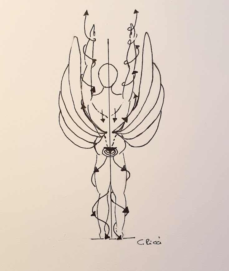 Come un uccello con grandi ali sentiamo che la spinta delle braccia verso l’alto può essere sostenuta da tutto il tronco e, partendo proprio dalla zona dei reni e più internamente dal core, il movimento ci può regalare la sensazione di estenderci oltre i limiti del corpo. Ci si connette alle costole fluttuanti che circondano i reni, grazie alle quali il bordo del diaframma è attaccato ai quadrati dei lombi e che sono intimamente connesse al respiro.