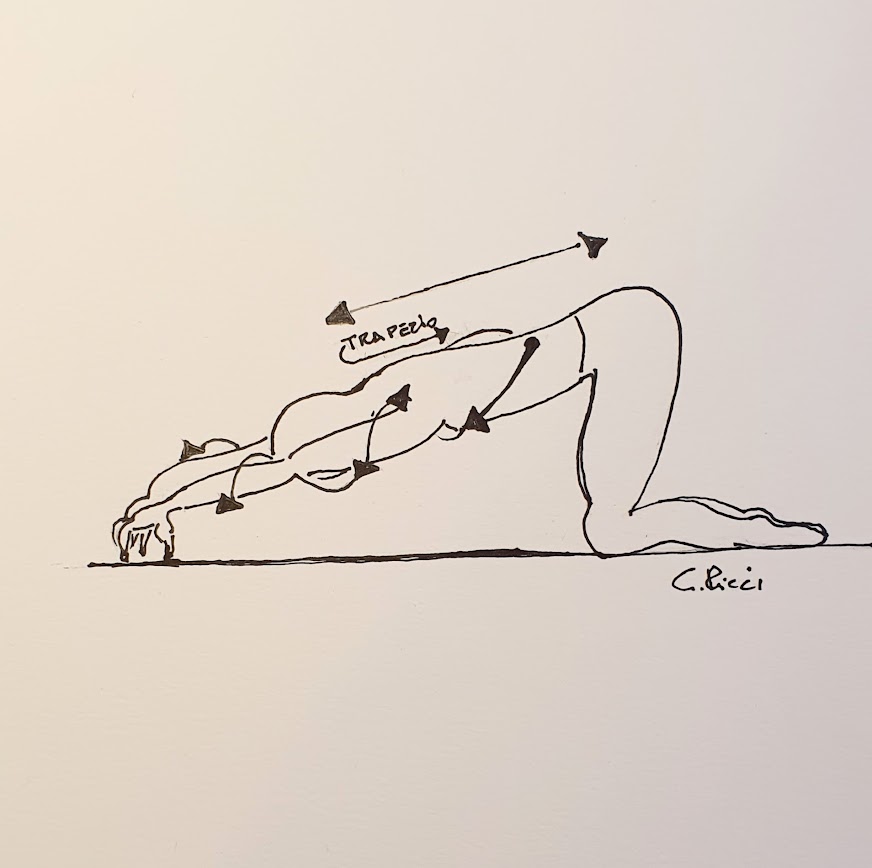 Il trapezio scende, le scapole si separano e la zona dei reni si connette contemporaneamente con le braccia e con le gambe mentre si inizia a sentire lo psoas che si allunga.